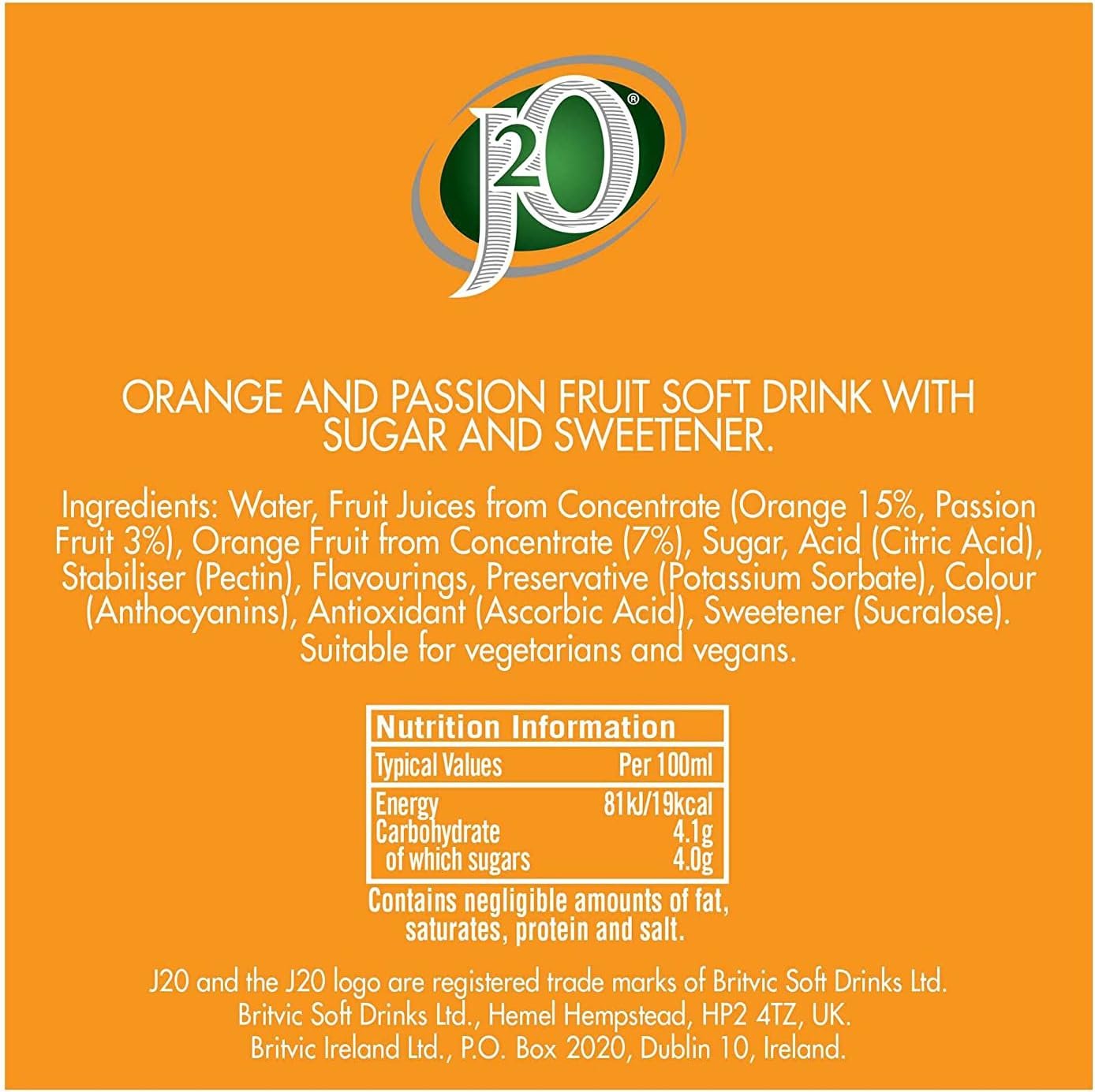 Product Dimensions ‎26.6 x 20.2 x 25.6 cm; 3.23 Kilograms Item model number ‎920501 Additives ‎Acid (Citric Acid), Stabiliser (Pectin), Preservative (Potassium Sorbate), Colour (Anthocyanins), Antioxidant (Ascorbic Acid), Sweetener (Sucralose). Allergen Information ‎Contains: Wheat Free, Molluscs Free, Rye Free, Fish Free, Sesame Seeds Free, Mustard Free, Crustacean Free, Celery Free, Milk Free Weight ‎5 Kilograms Volume ‎3000 Millilitres Units ‎3000.0 millilitre Serving Recommendation ‎250ml Manufacturer contact ‎Hemel Hempstead, HP2 4TZ Country of origin ‎United Kingdom Brand ‎J2O Format ‎Liquid Age Range Description ‎Adult Speciality ‎Low Calorie Package Information ‎Tin Manufacturer ‎Britvic Soft Drinks Ltd. Country of origin ‎United Kingdom